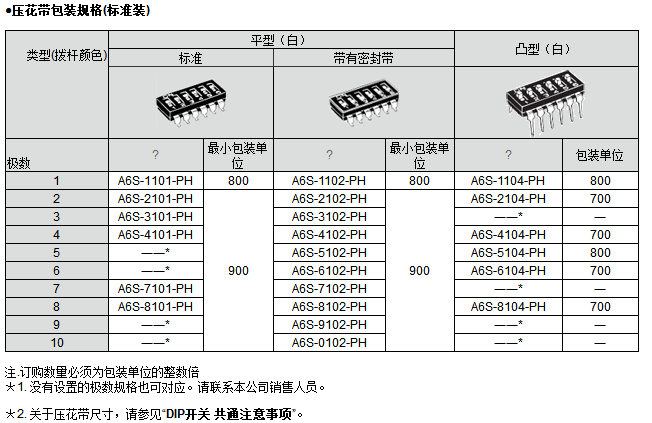 產品說明:A6S-H 滑動型DIP開關 更新了以往產品(A6S),提高了焊接耐熱性的表面安裝端子型。 ? 與以往產品(A6S)安裝互換,提高相同形狀的焊接耐熱性。(焊接最高溫度:260℃) ? 接點部分為鍍金雙接點,通過動作的自清潔構造,確保了高可靠性。 ? 備有可以清洗的帶密封帶型。 ? 有最適合自動安裝的壓花帶裝箱規格。(也對應...