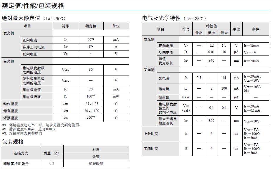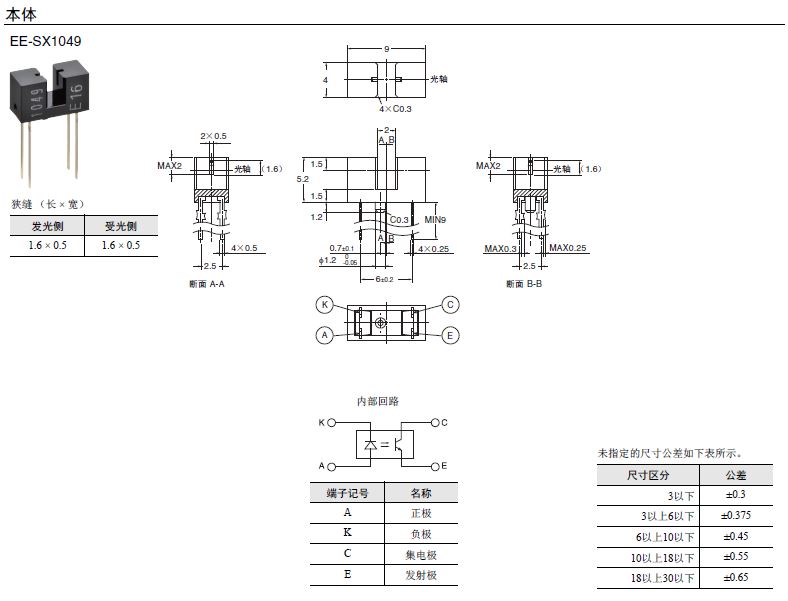 產(chǎn)品說明:EE-SX1049 微型光電傳感器(透過型) 小型凹槽端子型(槽寬:2mm) ? 薄型(高度:5.2mm) ? 印刷基板用端子 ? 帶防止反向插入的定位凸臺