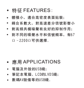特征: 體積小,適合高密度表面貼裝; 耦合系數(shù)大,對(duì)高速差分信號(hào)影響小;