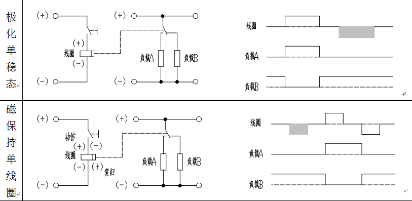 8.2 磁保持繼電器:線圈被激勵時觸點動作,線圈去掉激勵后,觸點仍保持該狀態,要使觸點回復原狀,需要給單線圈型的線圈施加反向激勵,或雙線圈型的復歸線圈施加激勵。