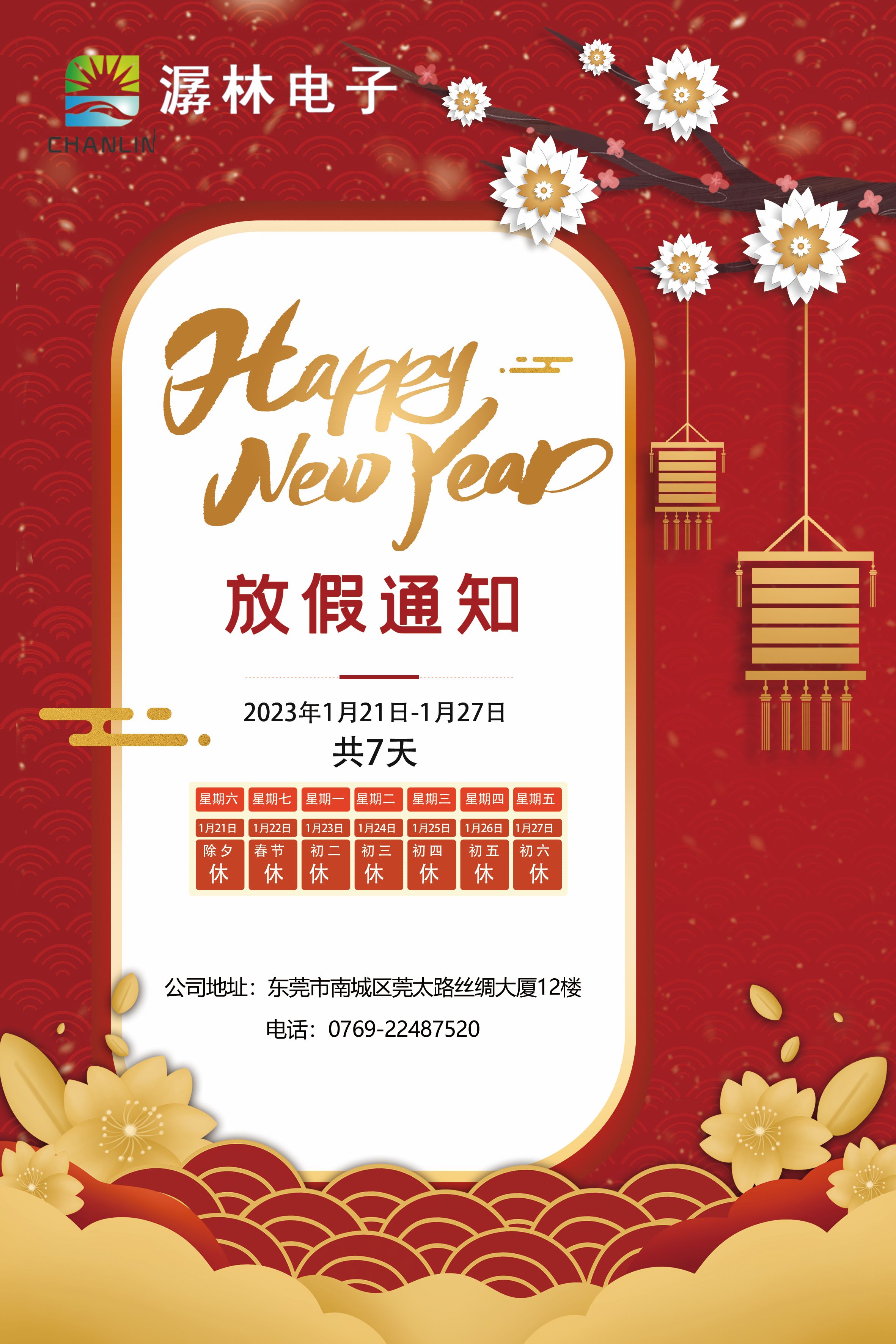 您好!感謝您對潺林的支持和厚愛!正值新春佳節來臨之際,東莞市潺林電子有限公司攜全體員工在此向您及您的家人送出最真摯的祝福:祝您新年快樂!萬事如意!在新的一年里身體健康!事業更上一層樓!在新的一年里我們也將以更真誠,專業的服務回饋廣大客戶!