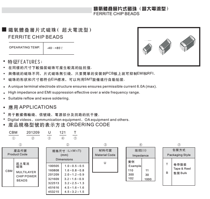 特征: 在同樣的尺寸下較插裝磁珠可產生較高的阻抗值 。 與傳統的磁珠不同,片式磁珠無引線,只要簡單的安裝到PCB板上就可抑制EMI和RFI 。 磁珠的形狀和尺寸都符合EIA標準,可以利用SMT設備進行自動貼裝。