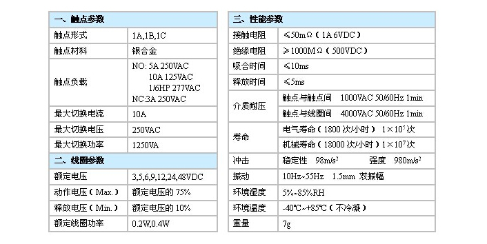 觸點容量:NO:5A 250VAC,10A 125VAC,1/6HP 277VAC NC:3A 250VAC