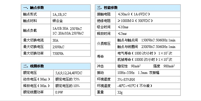 觸點容量:1A/1B:30A 250VAC 1C: 20A/10A 250VAC