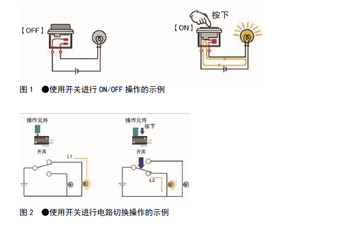 例如圖1中所示,在電源和電燈之間連接一個開關,當受到按壓開關的外力作用時,就會進行使電燈點亮的“ON”操作或使電燈熄滅的“OFF”操作。圖2是電路切換的應用例。在開關未按下時,L1電路的燈亮起,按下開關后,電路發生切換,L2電路的燈亮起。