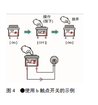 b觸點的接觸規格與a觸點相反。即,不操作開關時兩個觸點端子呈閉合狀態(ON),操作開關后則分離(OFF)。在圖4所示的電路中,操作開關(按下)時燈熄滅,不操作時燈亮起。希望通過操作開關停止負載運行時可以使用b觸點。