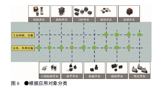 根據應用對象及目的,開關可以分成很多種類。根據應用對象來分類,有用于大型工業機械及設備的限位開關、按鈕開關。這類開關的特點是尺寸大、結構堅固(圖6)。此外,微動開關、小型檢測開關、輕觸開關、扭子開關、按鍵開關、船形開關、撥碼開關、DIP開關則用于中小型業務設備及民用設備。這類開關小巧、低矮的特點可以使設備更小、更薄、更輕。