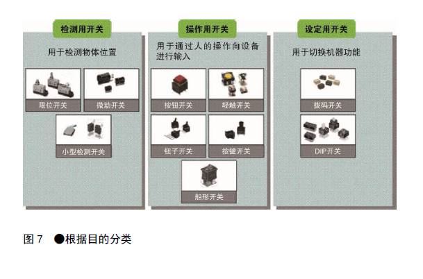 開關的主要目的可分為檢測/操作/設定三類(圖7)。其中,檢測開關有檢測物體位置的限位開關、微動開關、小型檢測開關。這些開關在各種用途中可以發揮高精度位置檢測功能。