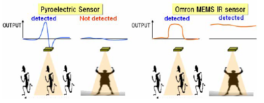 在人體檢測方面,歐姆龍溫度傳感器比傳統的熱電傳感器更具優勢。