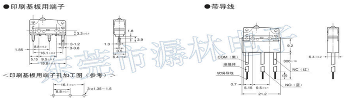 備有焊接端子,#110接線片端子、印刷基板用端子 、帶分模導線等各種型號。印刷用基板端子為標準化等距型。