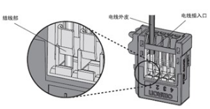 2、將電線插入到電線插入口的深處。電線的外皮必須進入到電線插入口內部,并確認導線尖端通過了接線部。 |