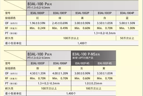 潺林電子為大家介紹歐姆龍新型長行程、輕觸式開關:B3AL系列:按鍵分為紅色B3AL-1000、綠色B3AL-1001、黑色B3AL-1002、白色B3AL-1003,等多種類型。壓花帶卷盤裝型。