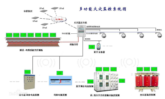 其基本原理是,當電氣設備中的電流、溫度等參數發生異常或突變時,終端探測頭(如剩余電流互感器、溫度傳感器等)利用電磁場感應原理、溫度效應的變化對該信息進行采集,并輸送到監控探測器里,經放大、A/D轉換、CPU對變化的幅值進行分析、判斷,并與報警設定值進行比較,一旦超出設定值則發出報警信號,同時也輸送到監控設備中,再經監控設備進一步識別、判定,當確認可能會發生火災時,監控主機發出火災報警信號,點亮報警指示燈,發出報警音響,同時在液晶顯示屏上顯示火災報警等信息。值班人員則根據以上顯示的信息,迅速到事故現場進行檢查處理,并將報警信息發送到集中控制臺;