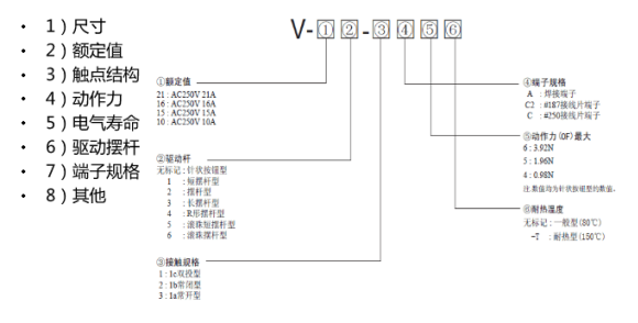 歐姆龍的微動(dòng)開(kāi)關(guān)要如何選型呢?我們來(lái)看下圖是歐姆龍的型號(hào)標(biāo)準(zhǔn),每項(xiàng)代表著微動(dòng)開(kāi)關(guān)對(duì)應(yīng)的參數(shù):如尺寸、額定值、觸點(diǎn)結(jié)構(gòu)、動(dòng)作力、電氣壽命、驅(qū)動(dòng)擺桿、端子規(guī)格等
