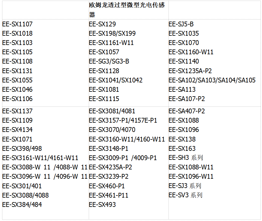對應(yīng)我們歐姆龍透過型微型光電傳感器又有哪些型號呢?我們通過下圖來了解一下: